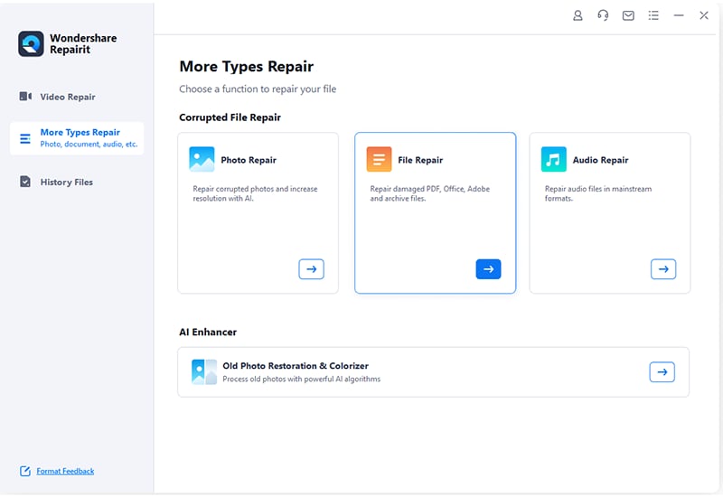 When it comes to repairing PDF files, you can access its File Repair feature. This robust AI-powered file repair toolkit is available for both desktop and online users. The online File Repair lets you fix a 300MB file size with 16 supported formats. However, the desktop version does not impose any file size limitations on the users. You can repair an unlimited number of files on the desktop version flawlessly. Along with PDF, this tool can also resolve corrupted Word, Excel, PPT, Zip, and Adobe files.