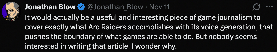Blow suggested a more “useful and interesting” piece would analyze what Arc Raiders actually achieves with its voice generation and how it pushes boundaries of what games can do. Instead, nobody seems interested in writing that article, he noted.
