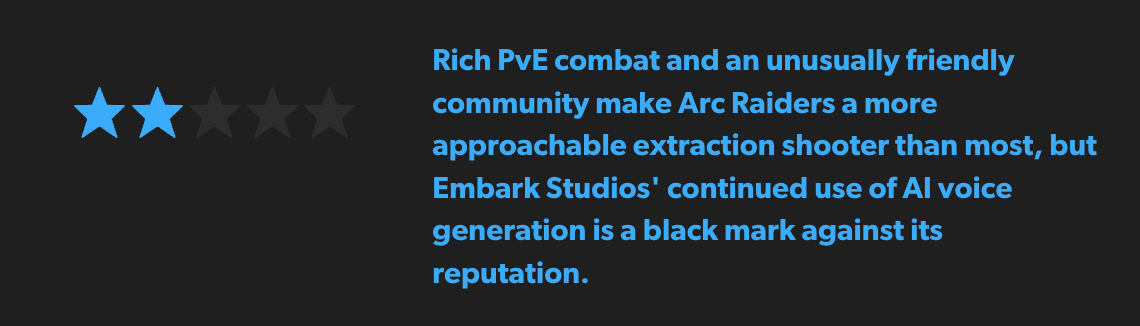 One of the sharpest points we would like to highlight is selective anger. Any game using AI automatically gets zero-out-of-ten from them, calling Arc Raiders unplayable on principle.