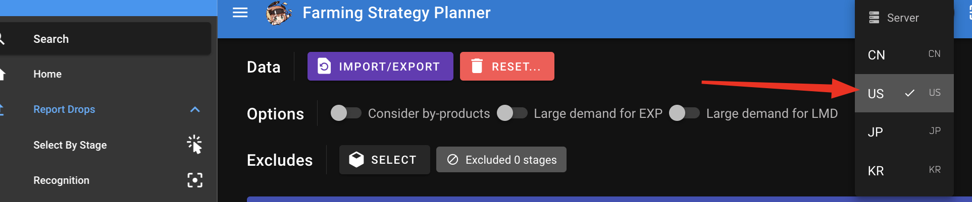Choose Your Server: Start by picking the server you play on (like CN or US) in the “Server” section. This makes sure the planner uses the right data for your server, as drop rates can be different in different regions