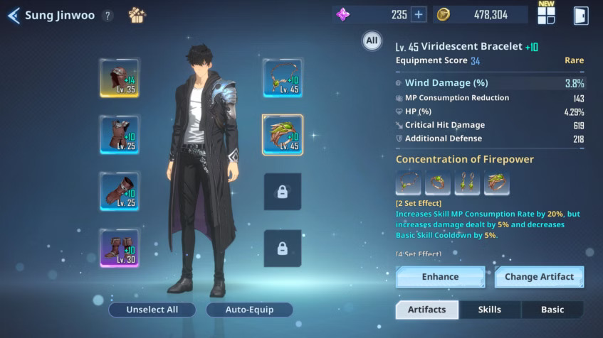 - ARM Set: Increases defense against physical attacks. Keeps Jin-Woo standing in tough fights.