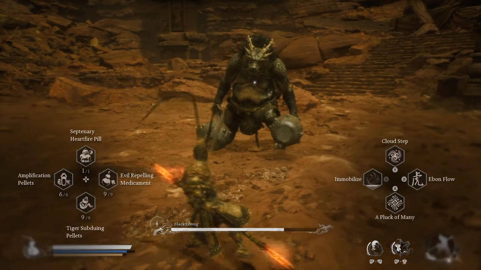 We found success by staggering Black Loong out of his attacks using a combination of level 4 smash and some spirit moves.