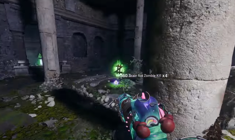 In front of a certain window, shoot the fallen statue’s head to start a Simon Says game. Shoot the glowing statue heads in the right order (left to right, then top and bottom rows) to get a free Brain Rot ammo mod.