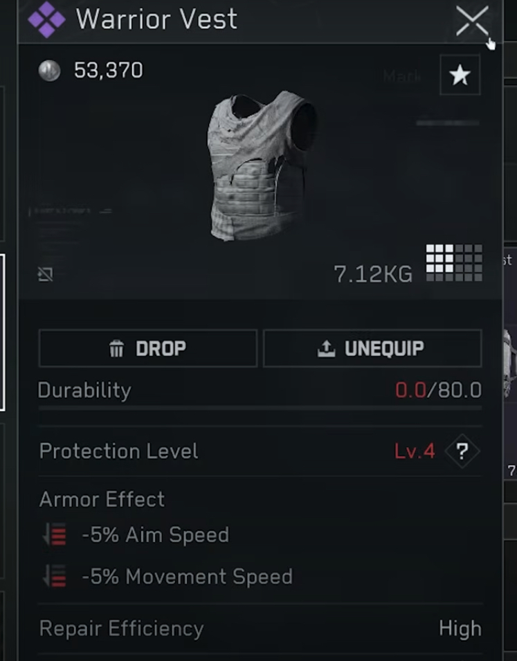 - Durability: Warrior vest loses only 6% maximum durability per repair.
