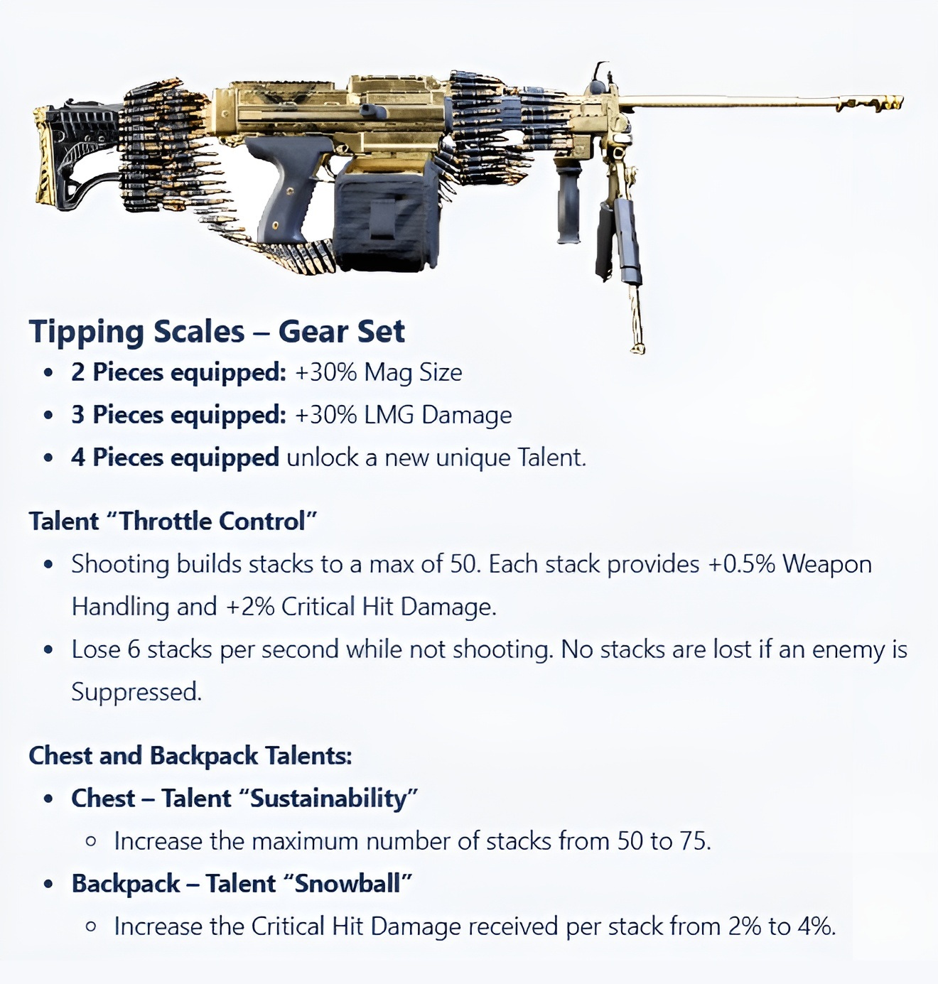 The Tipping Scales gear set brings a fresh and competitive choice for LMG fans in The Division 2. Its mix of magazine size, critical hit damage, and weapon control makes it a damage powerhouse.
