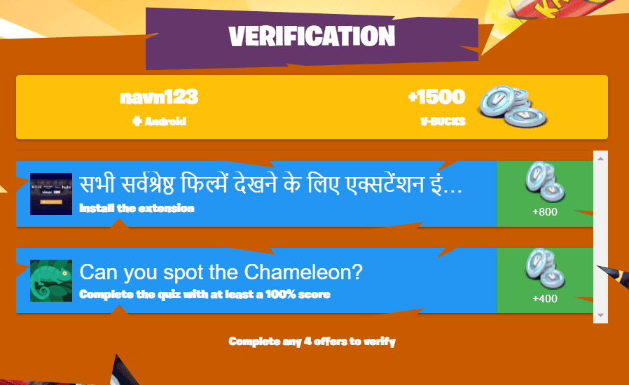 If you want to get V-Buck without any verification then we would recommended you to invest your time in legal ways so that your time get fruitful and you actually really receive V-Bucks.