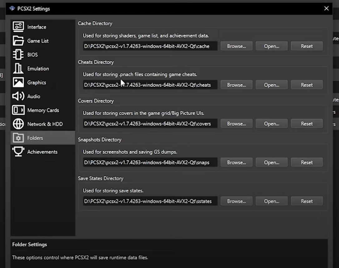 - Select the Folders option to display your cheats directory. This directory is used for storing .pnach files that contain the game cheats.