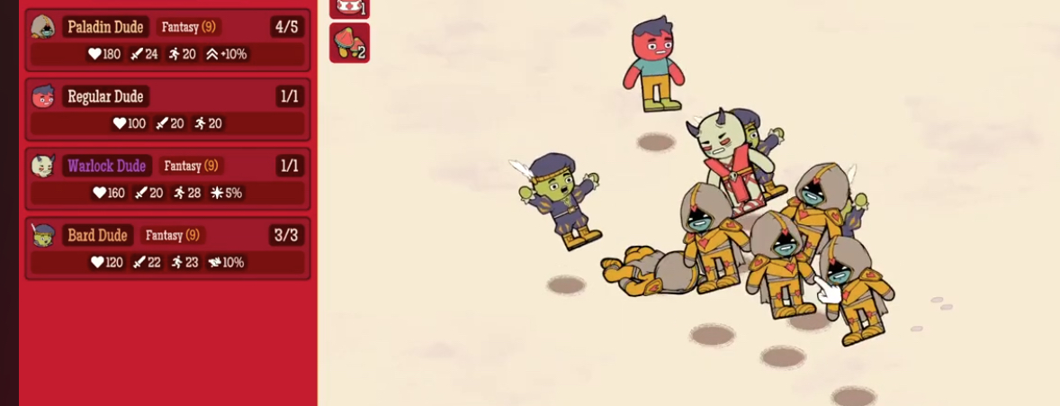 The first few minutes feel oddly relaxed. Early toddler fights go smoothly enough to earn some cash and start building a lineup. Recruitment is the core of the game. Each “dude” type has unique stats and abilities that work together. Part of the fun is the naming — Paladin Dude, Bard Dude, Warlock Dude — playful takes on classic RPG roles.