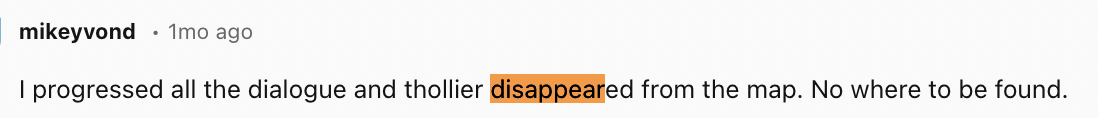 - NPC Disappearance: Some players have reported that Thiollier can disappear from the map even after all dialogues seem to be completed.