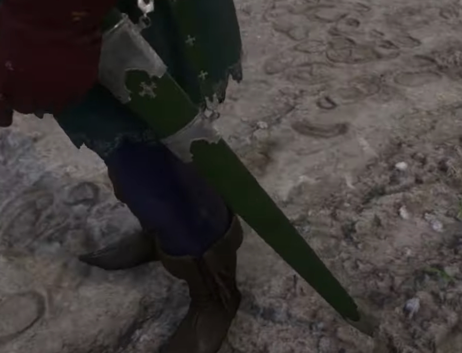 Besides its unique pommel, the sword also has a silver cross-guard with gold arrows pointing towards the center. It comes with a green scabbard, perfect for a “Green Knight” themed build. This sword is a reward for completing a specific side quest in the Kuttenberg region.