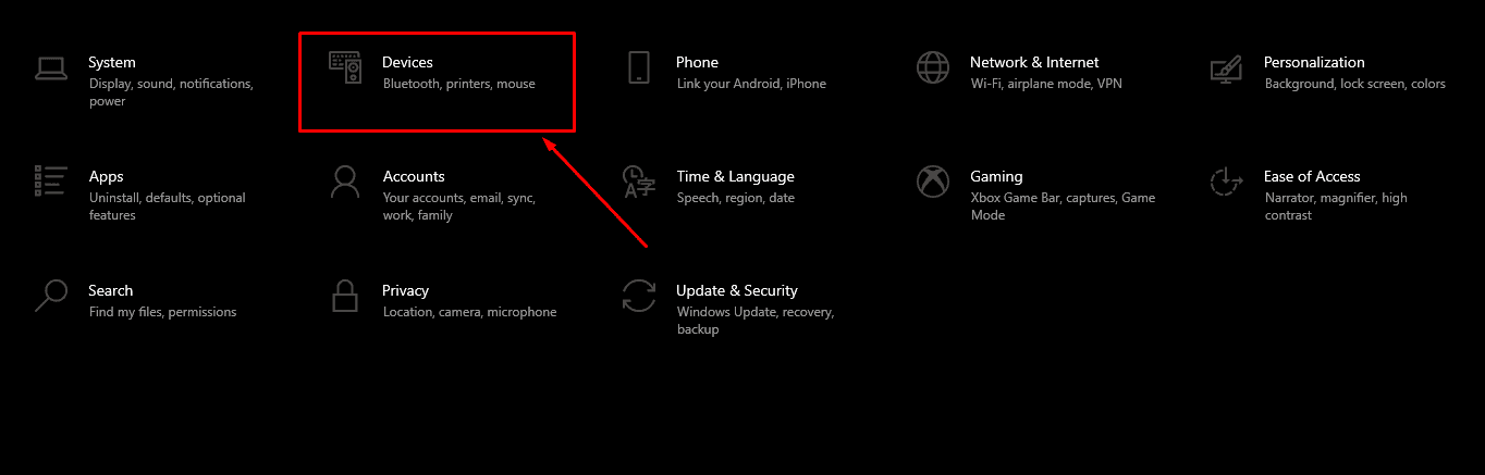 - Once the Windows 10 settings are open, select the Devices icon to proceed.