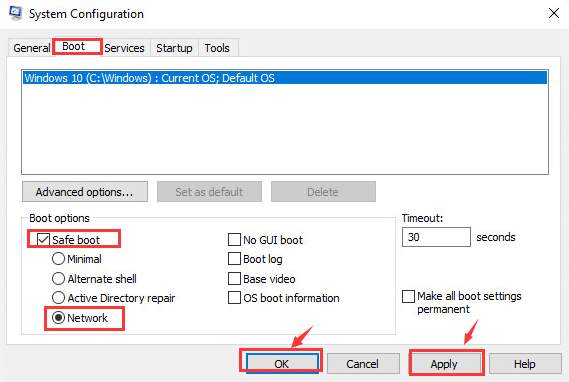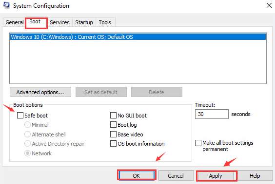 7) Once the troubleshooting process finishes, boot up your PC into a normal mode. Repeat step 1). Then go to the Boot tab and empty the box for Safe boot. Click Apply and OK to save and exit. Restart your computer into normal mode.